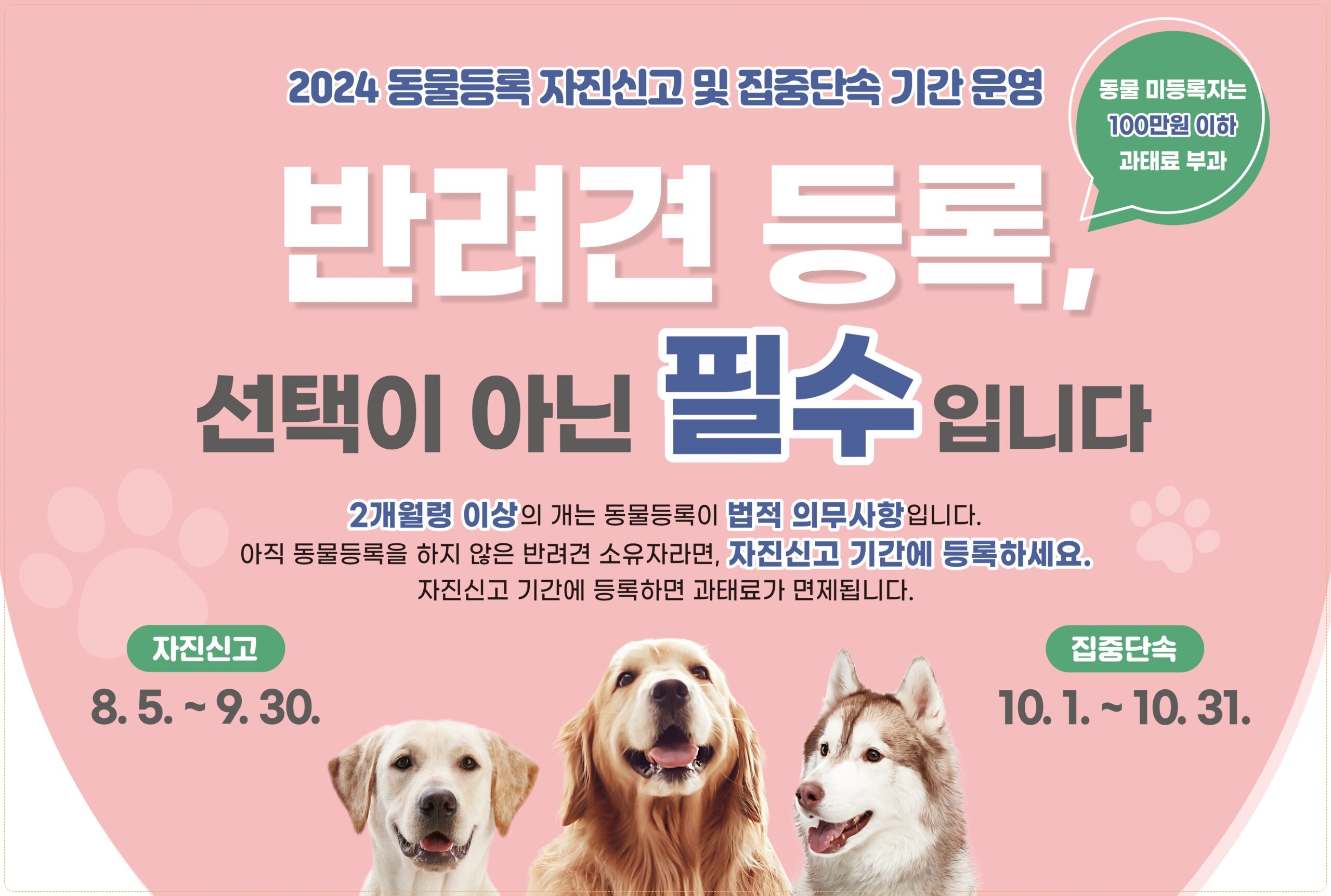 동물등록은 반려동물을 위한 첫 걸음입니다. 자진시고기간을 활용해 부담 없이 등록하고, 변경사핟오 잊지 말고 신고해주세요.